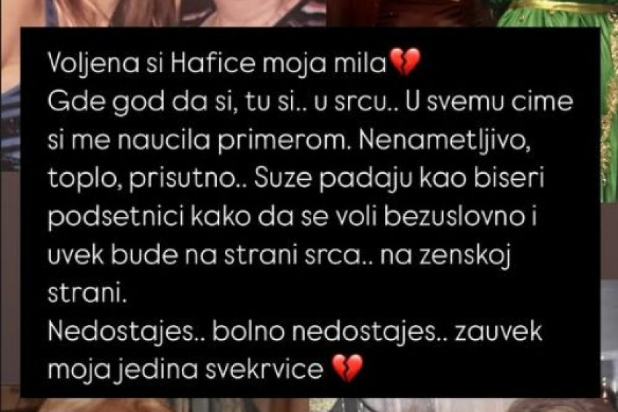 - Voljena si Hafice moja. Gde god da si, tu si u srcu. U svemu čemu si me naučila primerom. Nenametljivo, toplo, prisutno. Suze padaju kao biseri podsetnici kako da se voli bezuslovno i uvek bude na strani srca, na ženskoj strani - napisala je Elena Karaman o svekrvi Hafi i dodala:
