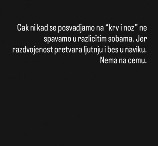 - Čak ni kad se posvađamo na "krv i nož" ne spavamo u različitim sobama. Jer razdvojenost pretvara ljutnju i bes u naviku. Nema na čemu - podelila je Goca savet za očuvanje braka.