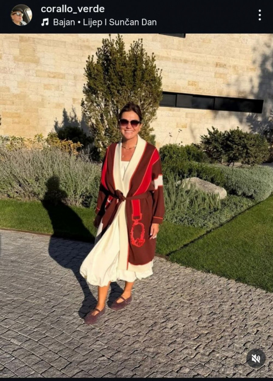 Na jednoj od najnovijih fotografija Branka pozira u svom dvorištu, okupana toplim jesenjim suncem. U lepršavoj beloj haljini i modernom kardiganu u nijansama braon i crvene, s osmehom na licu i tamnim naočarima, odiše spokojem i zadovoljstvom.